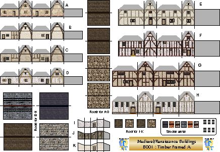 3 sheets of buildings [B001-003] plus a full sheet of walls, fences and roads to enhance your based buildings. A total of 18 buildings |