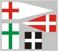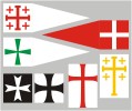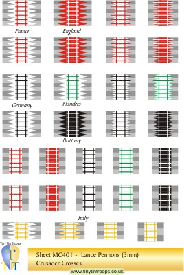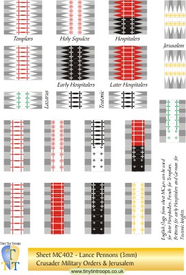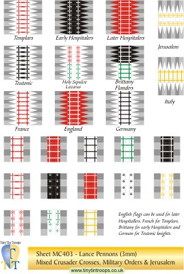Military Order Crosses & Jerusalem on lance pennons in 3 designs: 3mm high by 9mm pointed, 3mm square and 4.5mm tall by 3mm wide. For Templars, Hospitalers (early and later), Teutonic, Holy Sepulcre and Lazarus. |