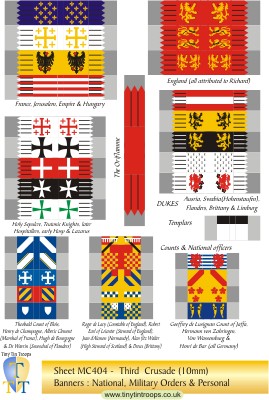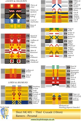 Banners for 3rd Crusade: All gonfalons. 13x8mm Counts & Viscounts & 28 6mm Lords & Seigneurs of lesser rank. |