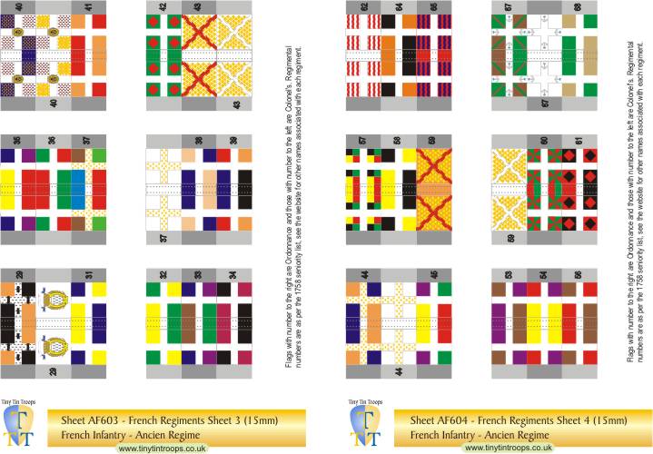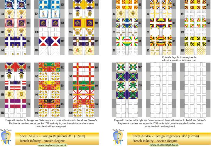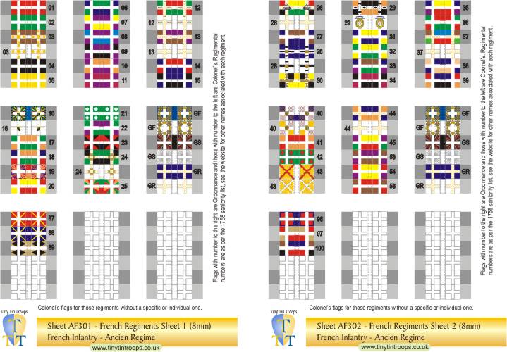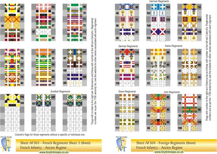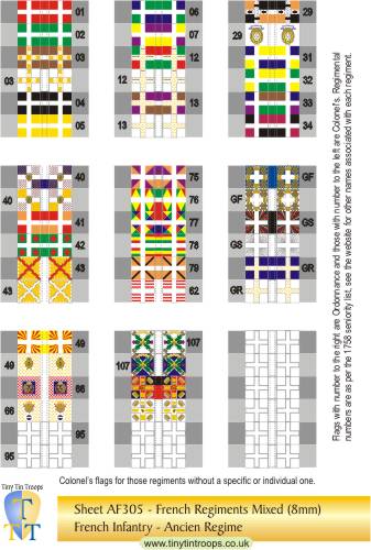 | AF303 | 8mm | French Regiments #57-86, 104, 105, GF, GS & Gd Roy plus 12 white Colonels' flag. 2 Scottish regt (107 & 103). | 54 | |||||||||||||||||||