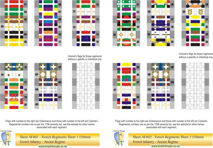 | AF401 | 10mm | French Regiments #1-20, GF, GS & Gd Roy plus 6 white Colonels' flag | 36 | |||||||||||||||||||