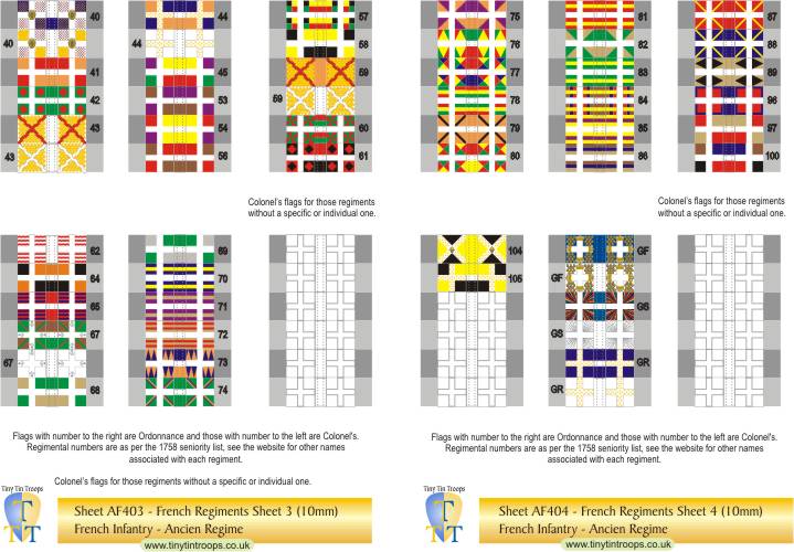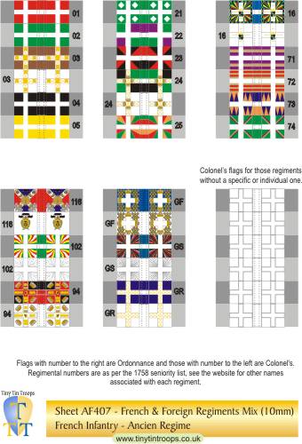 | AF402 | 10mm | French Regiments #21-39, GF, GS & Gd Roy plus 6 white Colonels' flag | 36 | |||||||||||||||||||