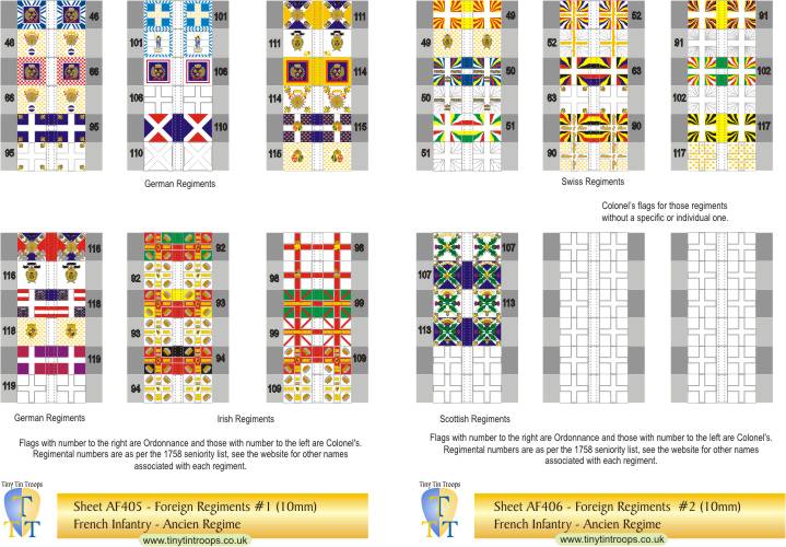| AF406 | 10mm | Foreign Regiments : 9 Swiss & 2 Scottish. 14 white Colonels' flag | 36 | |||||||||||||||||||