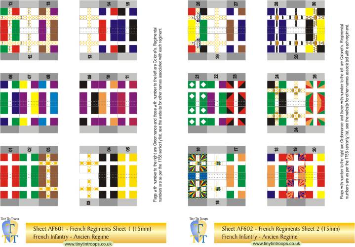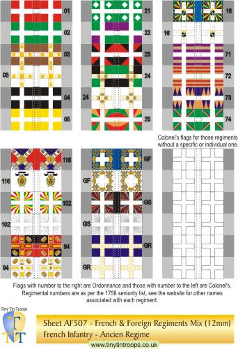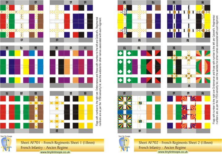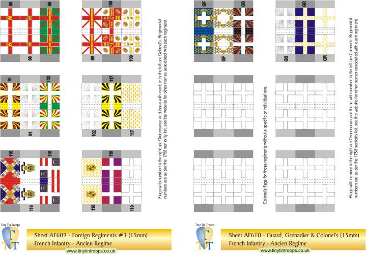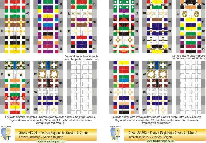 | AF501 | 12mm | French Regiments #1-20, GF, GS & Gd Roy plus 6 white Colonels' flag | 36 | |||||||||||||||||||