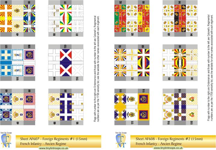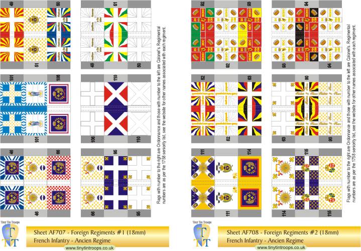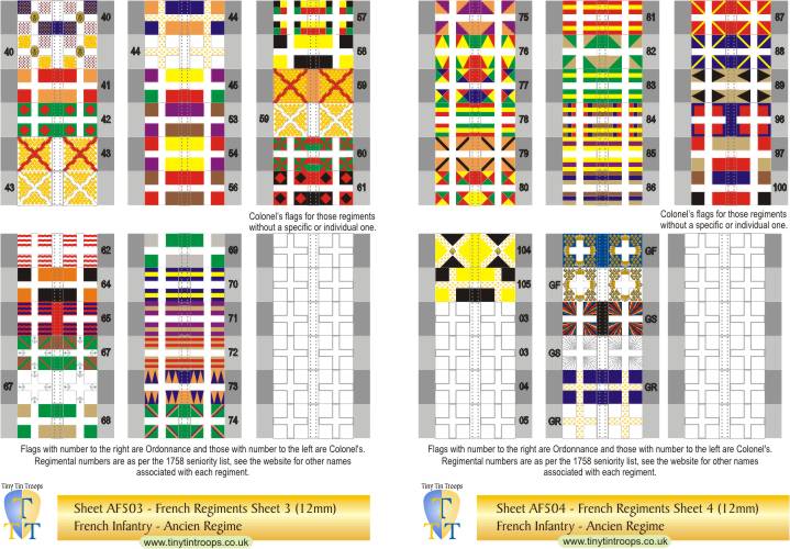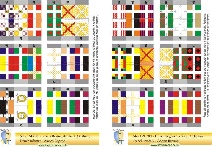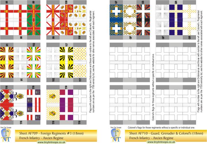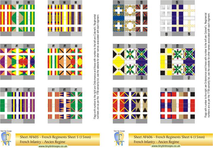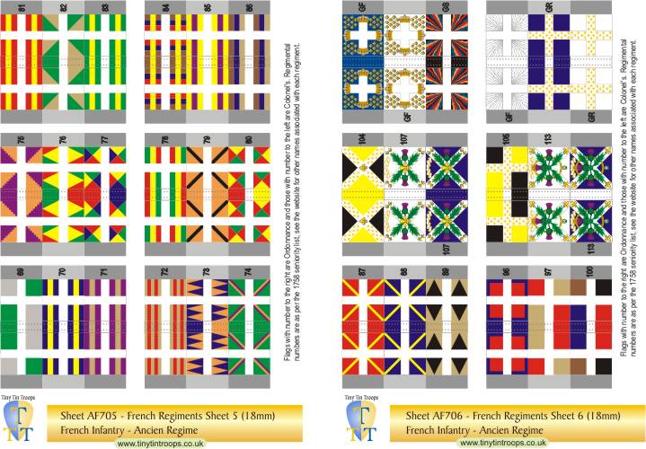 A comprehensive range of flags in 5 different sizes covering the French Army from the late 17th century to the Revolution. The first series covers regiments at the time of the Seven Years War but many of the flags were the same in earlier conflicts. There are both single sheets and multi-sheet sets with different arrangements of flags to suit a range of requirements.