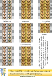 click for sheet image | 1 Leibfahnen & 18 German, 6 Hungarian & 3 Grenz Ordinarfahnen (39 flags) | 8mm - NAM301 | £3.30 | ||