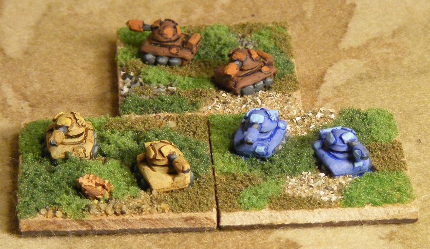 the models for more yet to start on. Most of them are from the GZG 'Germy's Micro Minis' range but I also have some of the Irregular 2mm Sci-Fi range and I'm using some of Oddizal Osmy 3mm WW2 infantry for the 'grunts'. Colour schemes are distinctly 'silly' - which reflects my view of this period. I want colourful and cute for the models and playable and quick for the rules without too much detail in the mechanics but interesting and novel tactical problems to solve. All bases are 30mm square MDF |